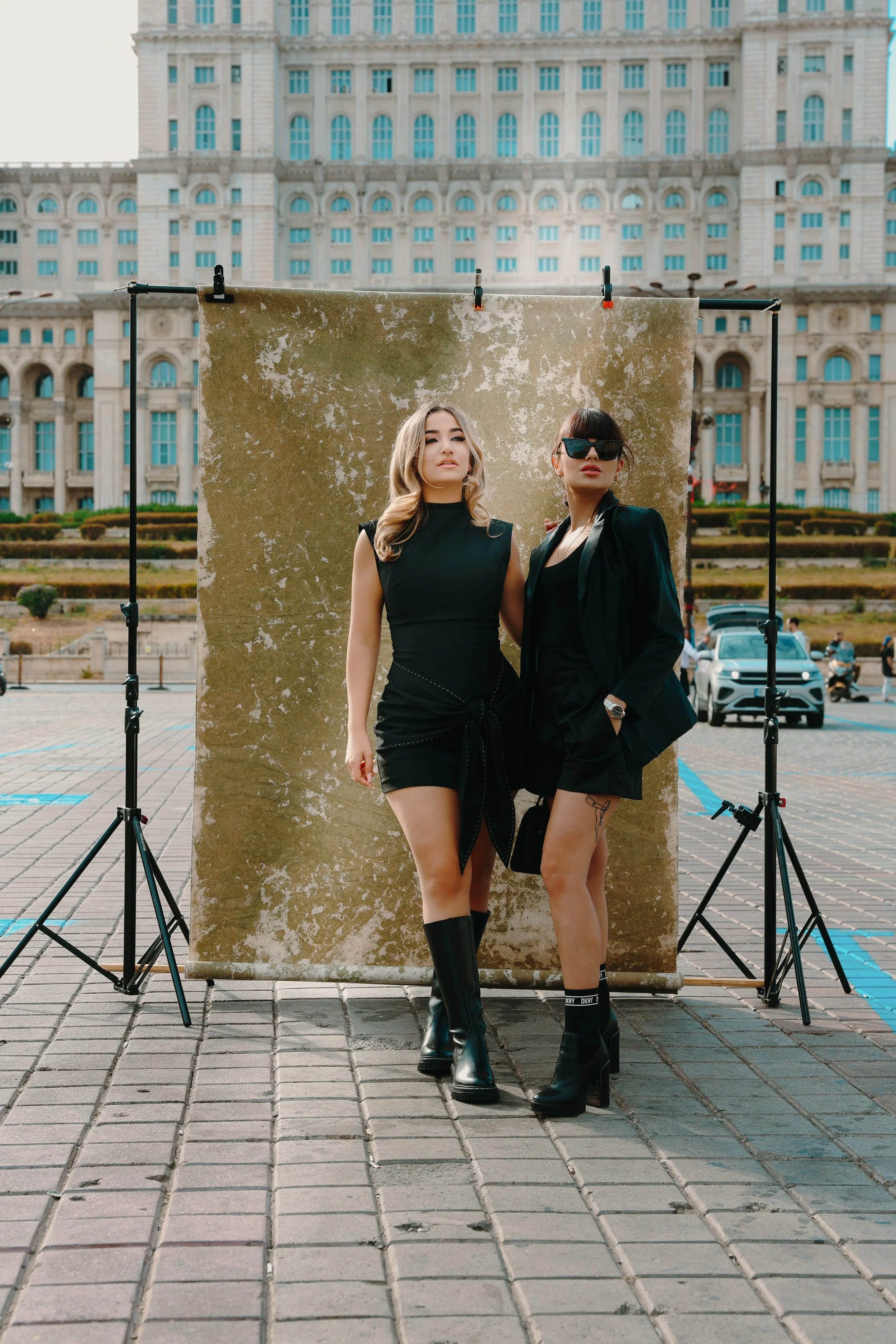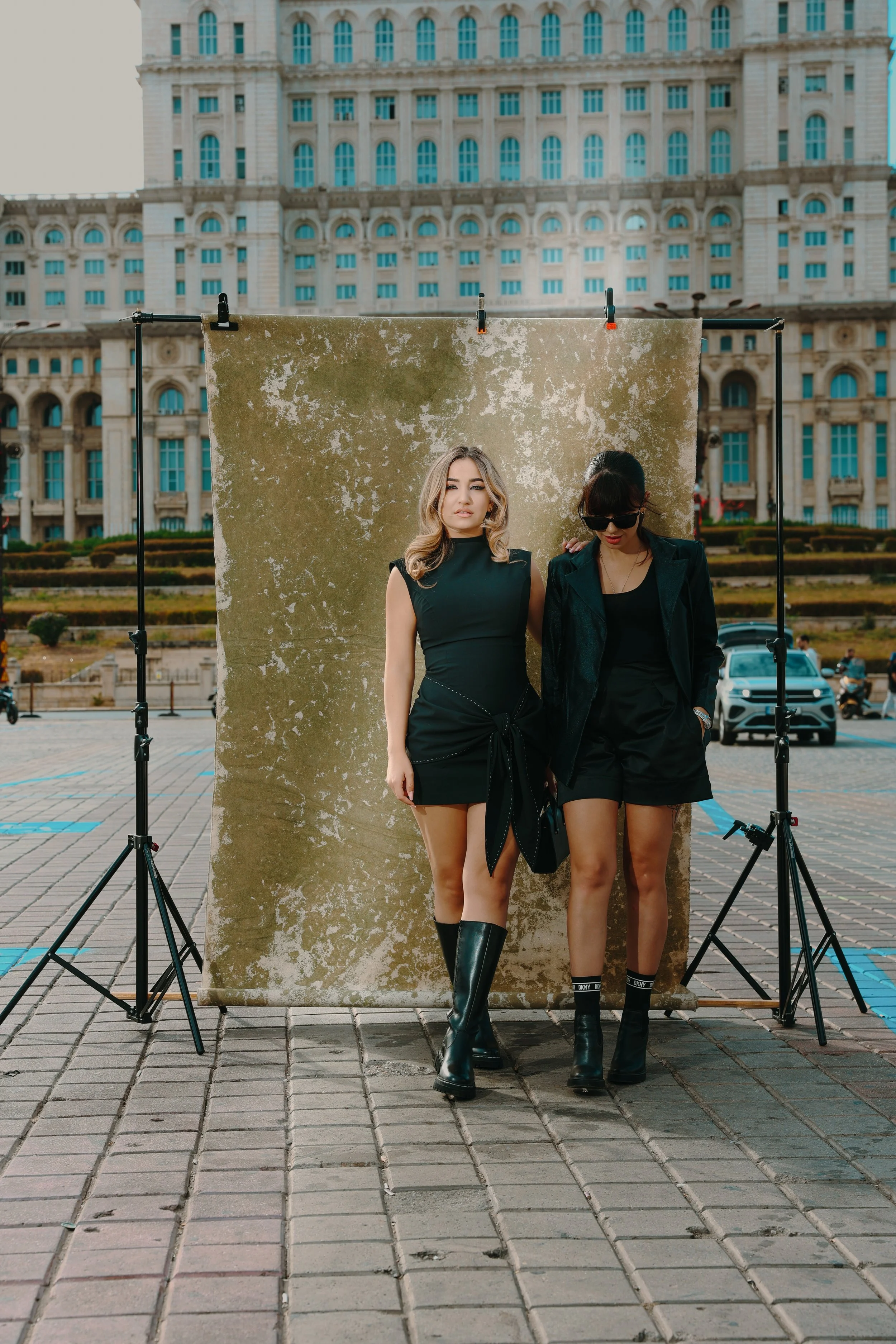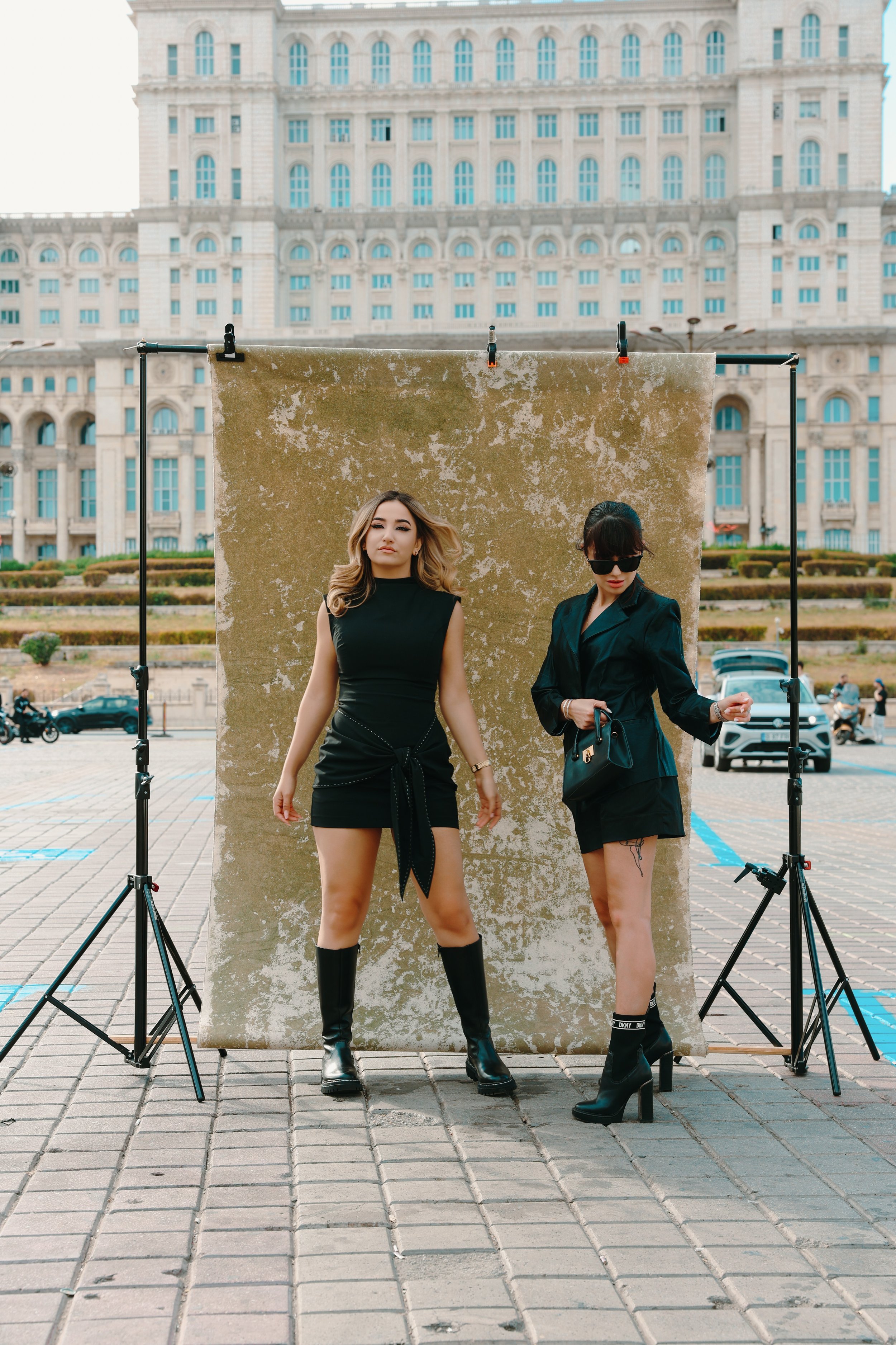 Sesiune foto street realizată în fața Casei Poporului din București. Fundalul de pânză aduce o notă artistică și minimalistă în mijlocul arhitecturii grandioase